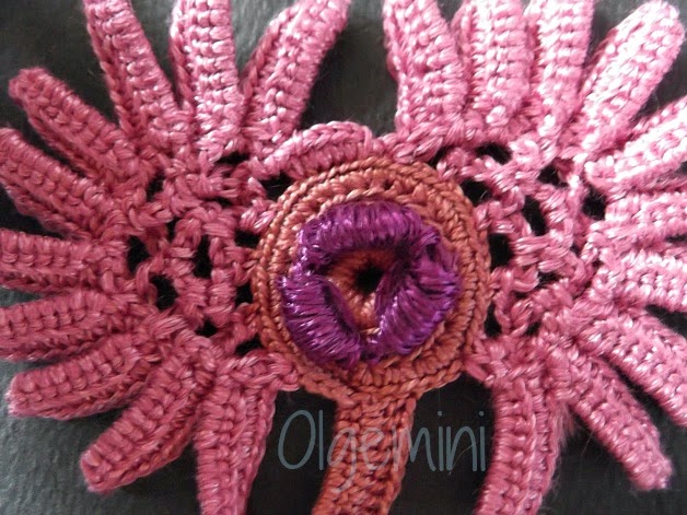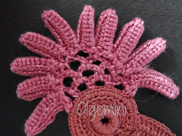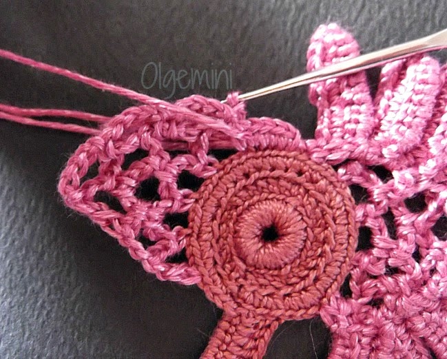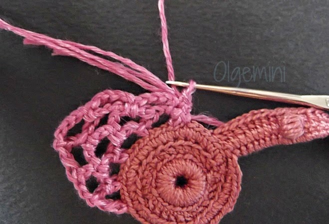 Напротив полученного элемента, к кругу прикрепить нить и бурдон коричневого цвета и продолжить вязание ими.