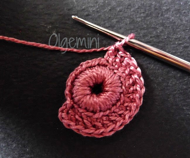 Обвязать «пуговицу» столбиками с 1 накидом, провязывая иногда по 2 столбика в одну петлю, чтобы полученный круг на стянулся.