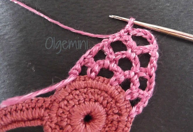 Без бурдона связать 2 ряда арок из 5 возд.п., пропуская по 3 ст.б.н. Не забывать, что в первом ряду последняя арка состоит из 2 возд.п., и 1 ст.б.н.
